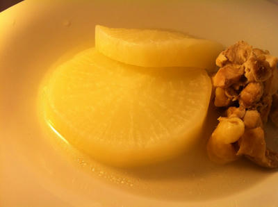 昆布でだしをとって、大根と鶏もも肉をそれぞれ煮ていました。