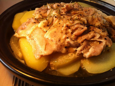 豚肉と野菜のタジン蒸しは、オリーブオイルを鍋に塗って、玉ねぎ、じゃがいも、豚肉を重ねて、塩とローズマリーを散らして、少量の白ワインと水を入れて弱火で15分ほど蒸しました。