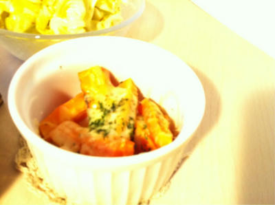 ココットにレンジで3分程チンしたにんじんをいれ、オリーブオイルを少したらし、塩をしてチーズとパセリをのせてオーブントースターで焼きました。