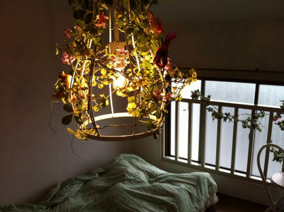 BeauBelleさんの照明♪鳥かごみたいで、オレンジと紫の鳥がとまってて可愛いし、壁に葉っぱが映って綺麗!