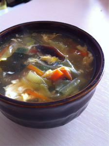 残り物野菜をウェイパーで煮て、醤油と酒で味付け、片栗粉でとろみをつけ、卵をひとつほぐしていれて、最後にお酢と豆板醤を好みの量いれます。