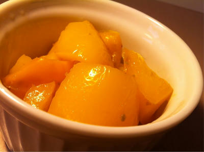 カボチャを切りやすいように4分ほどチンしてから皮をむいて、一口サイズに切ったら耐熱皿に水とカボチャをひいて、10分程チン。