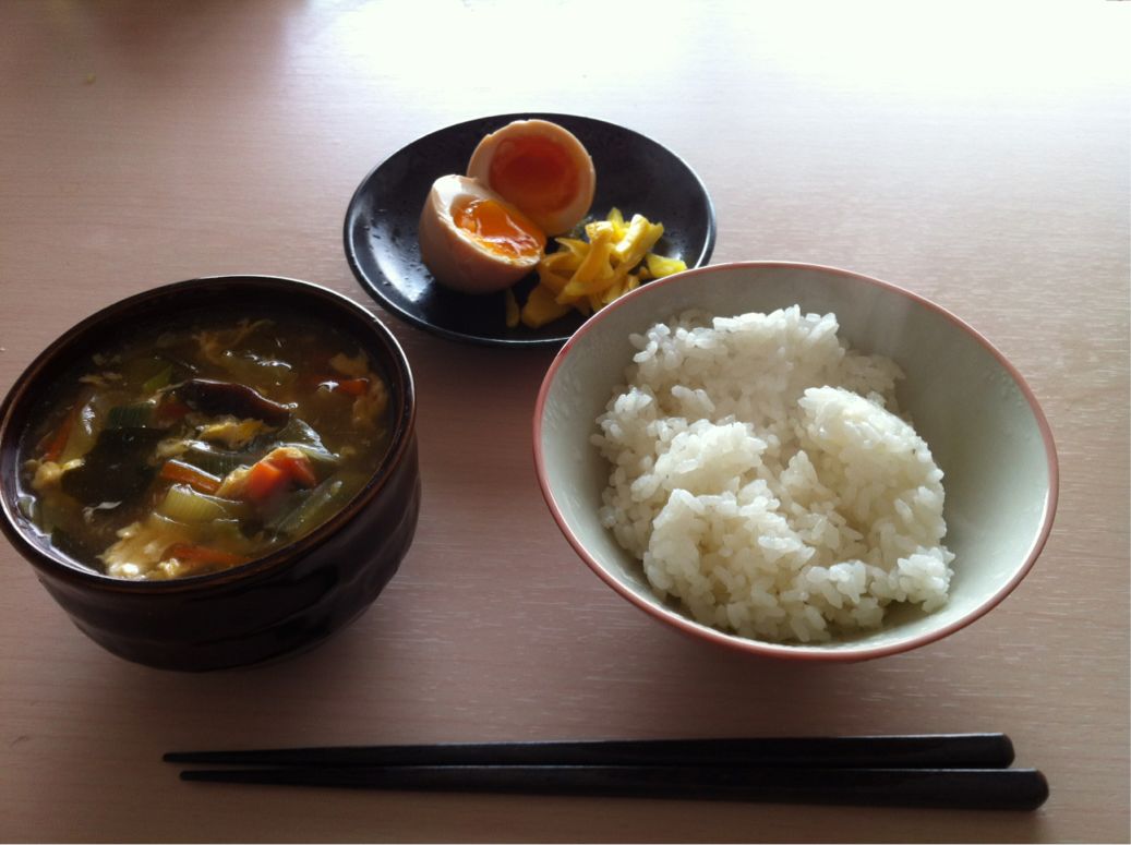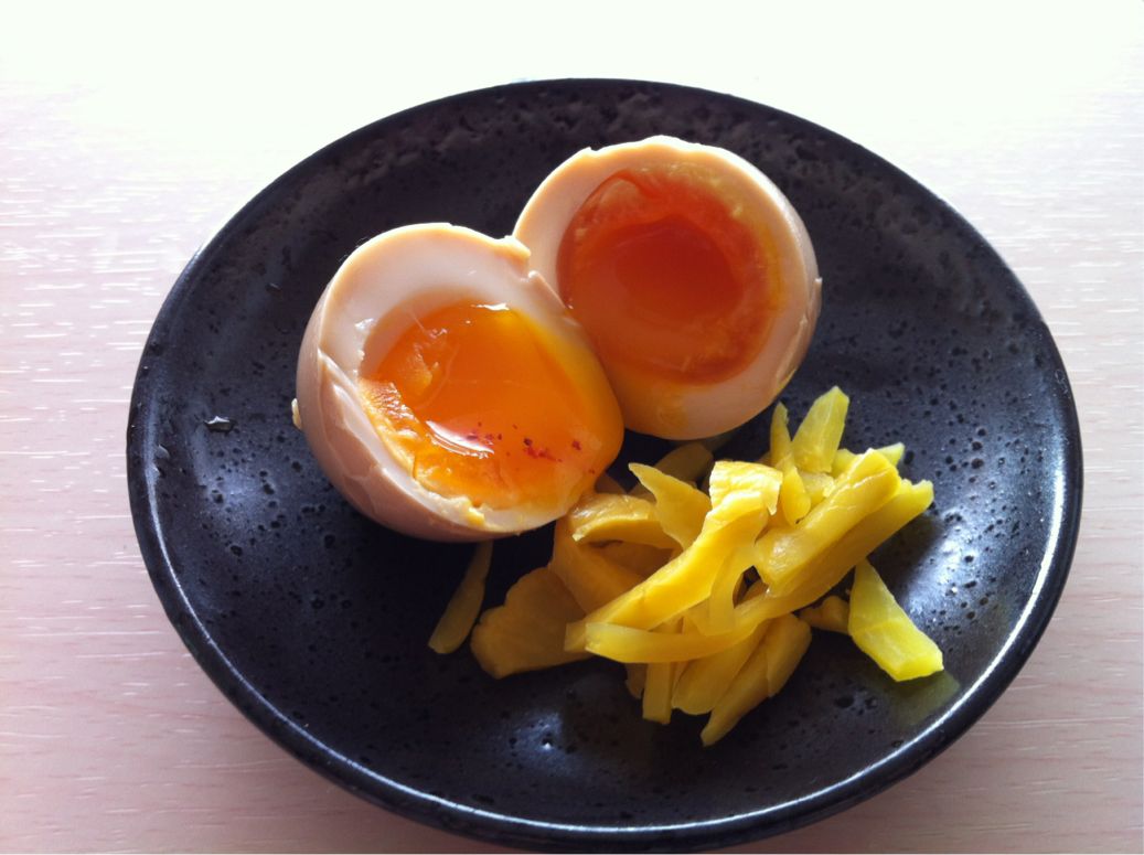 サンラータン、煮卵に刻みたくあん、納豆です。